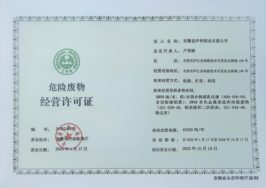 公司是较早一批获得安徽省危废经营许可证的企业,拥有以下危废代码的利用处置资质:321-026-48;321-034-48;900-006-09含切削液铝屑。